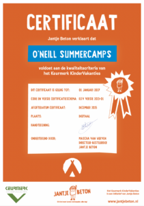 Wist je dat O’Neill SummerCamps één van de weinige kindervakantieorganisaties is die het Keurmerk Kindervakanties mag dragen? Een keurmerk van Jantje Beton. De organisatie die zich, net als wij, inzet voor meer speelruimte, beweging en een gezonde ontwikkeling van kinderen.